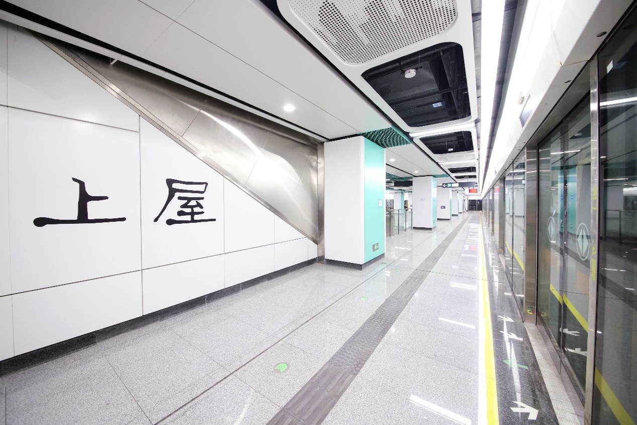 上屋站為標(biāo)準(zhǔn)站,車(chē)站以線路科技和生態(tài)特征為切入點(diǎn)進(jìn)行設(shè)計(jì),采用綠色為分段主題色彩,運(yùn)用折線空間線條,天花中的方框造型如城市的窗口,由深圳特色建筑群組成的天際線沖孔圖案有規(guī)律地間隔布置在方框中,象征著地鐵網(wǎng)絡(luò)與城市環(huán)境的融合。