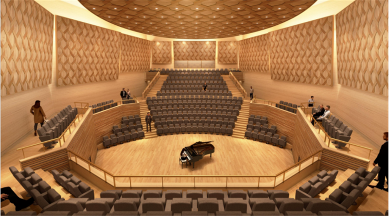 音樂廳為設有305座的中心式舞臺,觀眾席環(huán)繞表演區(qū)域。這種觀演形式可以更好地促進演員與觀眾的交流互動,音樂廳聲場經(jīng)專業(yè)設計,尤其適合小型的室內樂或古典樂獨奏。