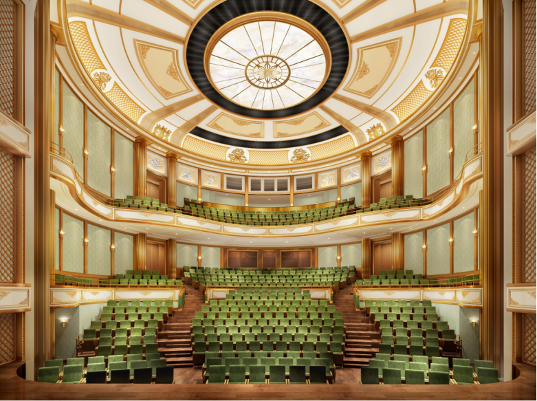 戲劇廳采用鏡框式舞臺,配置鼓筒轉臺(內置升降臺)與臺口前樂池升降臺;平面布置為“主舞臺+左側臺+右側臺”的三向組織,滿足戲劇、舞劇、小編制交響/合唱及綜藝晚會等多類型演出對快速轉場與復合景別的需求。