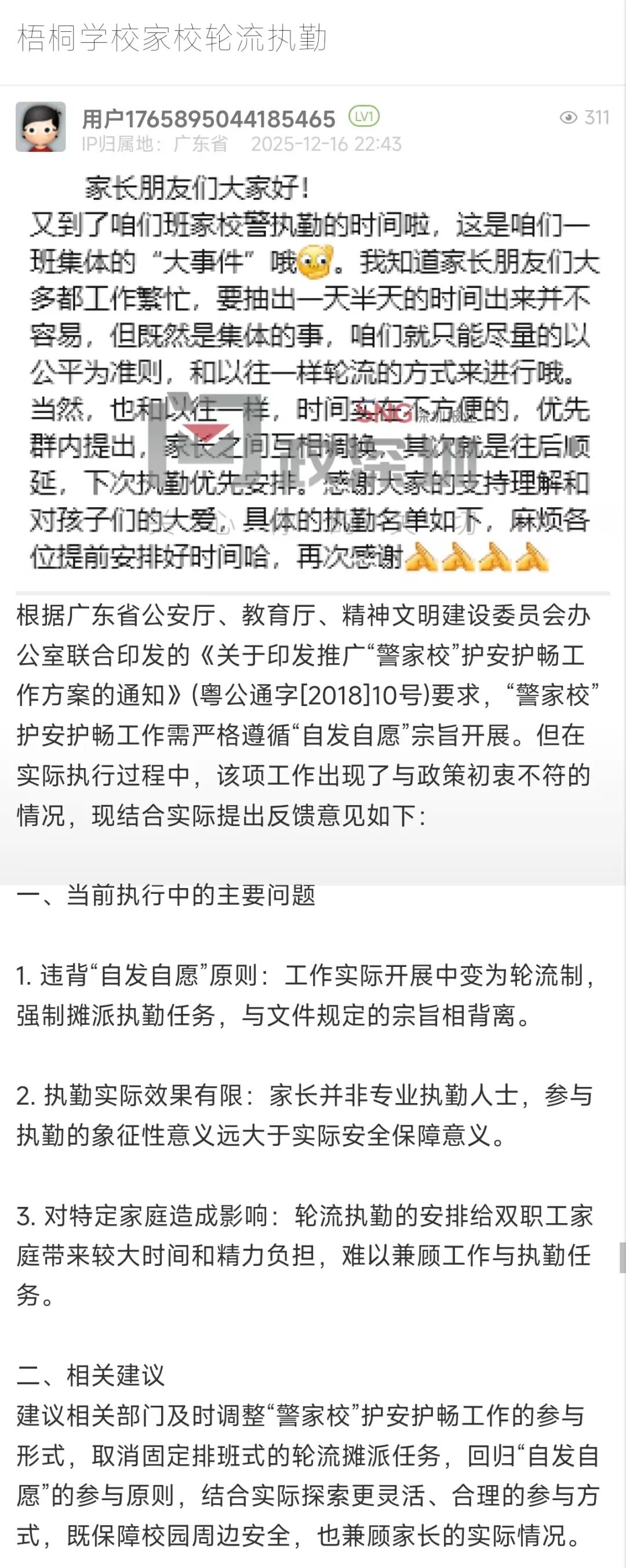 2. 執(zhí)勤實際效果有限:家長并非專業(yè)執(zhí)勤人士,參與執(zhí)勤的象征性意義遠大于實際安全保障意義。