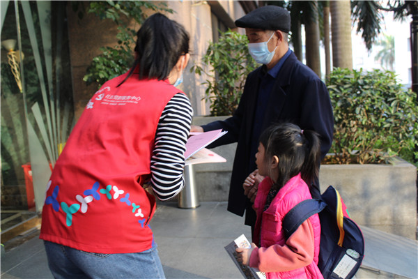 1月15日下午,深圳市羅湖區(qū)桂園街道老圍社區(qū)在轄區(qū)名仕閣小區(qū)開展2021年首場義工外展活動,義工與社工一起向過往行人發(fā)放《留深過年倡議書》,呼吁社區(qū)居民留在深圳,守望相助,共同抗疫。