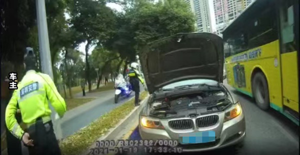 1月19日晚,羅湖交警筍崗中隊(duì)鐵騎隊(duì)員彭鉞崴、陳培斌巡邏至深圳市羅湖區(qū)泥崗路輔道轉(zhuǎn)北環(huán)大道路段時(shí),發(fā)現(xiàn)一輛煙霧彌漫著的小車突發(fā)故障,停放在路邊。