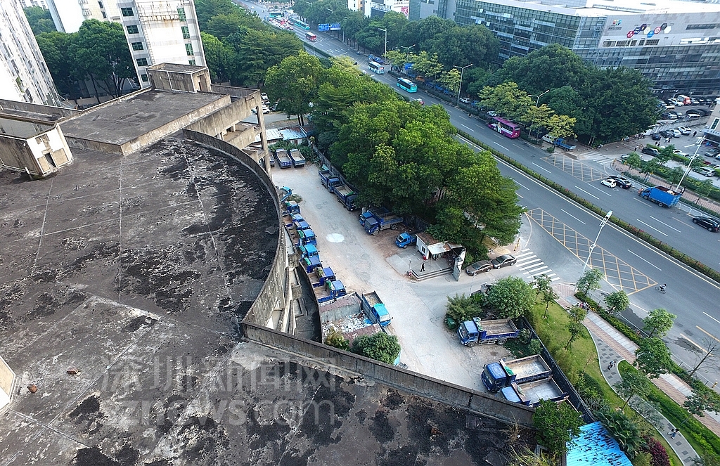 從高空看,在爛尾樓的圍墻內(nèi)停了許多泥頭車。?