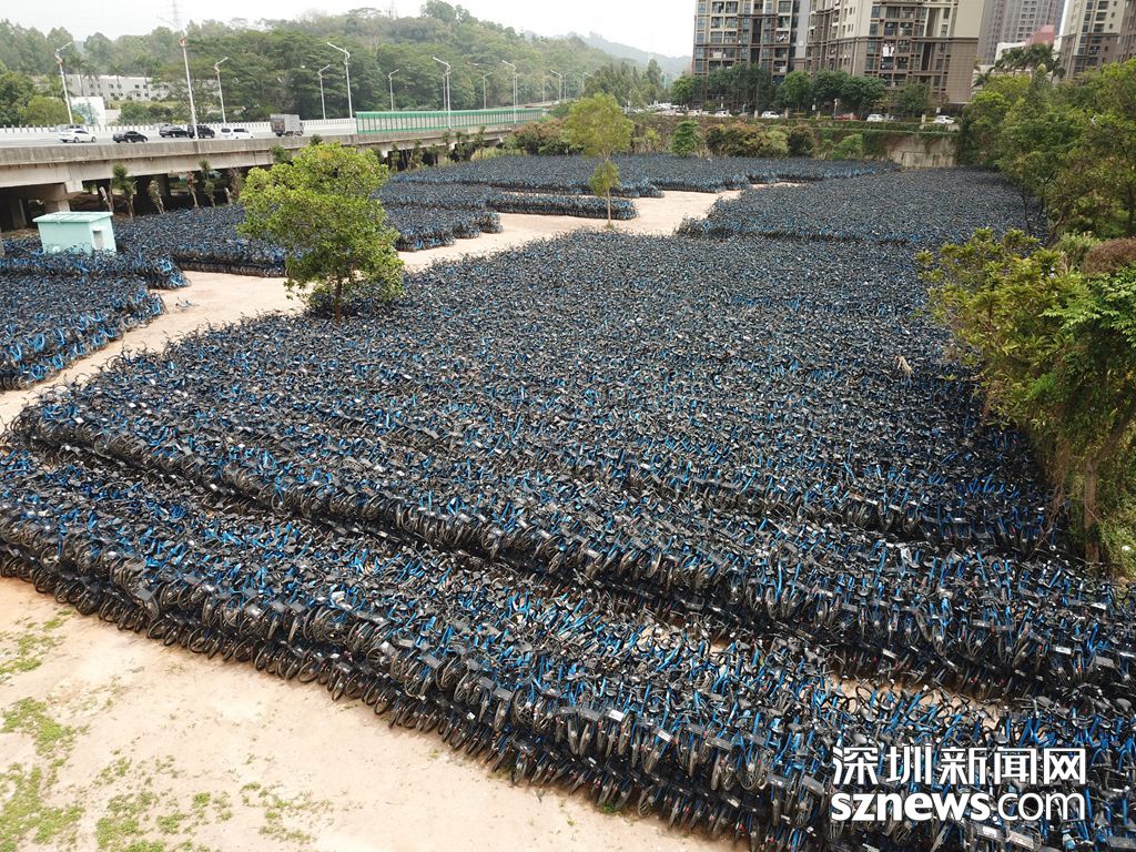 大量的小藍(lán)單車(chē)堆放在龍崗區(qū)水官高速旁的空地