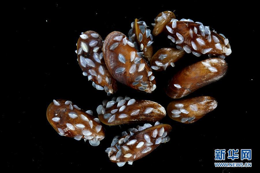 “深海勇士”號(hào)在“海馬冷泉”采集的貽貝樣品(5月19日攝)。新華社記者 張建松 攝
