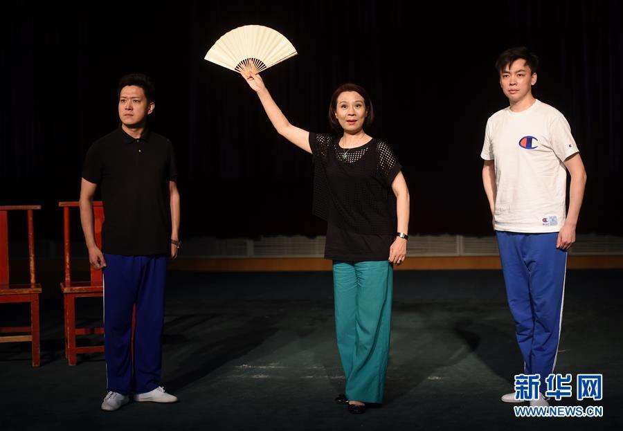 6月19日,扮演宋慶齡的遲小秋(中)和扮演宋子文的張建峰(左)、扮演張?zhí)椎淖T正巖(右)在排練中。新華社記者 羅曉光攝