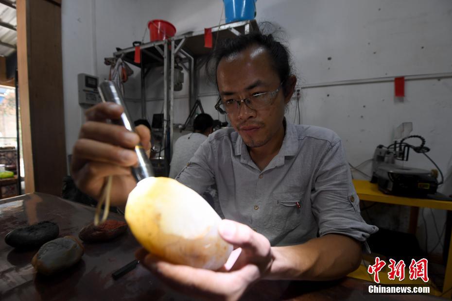 6月20日,廣西南寧市唐人文化街,錢思宇正在審料。1984年的錢思宇出生于湖南懷化,自小喜愛把玩石頭,受父輩影響,從2012年開始從事玉石雕刻工作至今。據(jù)了解,其設(shè)計的壯鄉(xiāng)玉雕作品,以人物為主,采用廣西當?shù)靥赜械氖?,結(jié)合壯文化中的銅鼓、壯錦等元素,通過刻畫“壯鄉(xiāng)人”的神態(tài),表達廣西特有的“壯鄉(xiāng)情”。中新社記者 俞靖 攝
