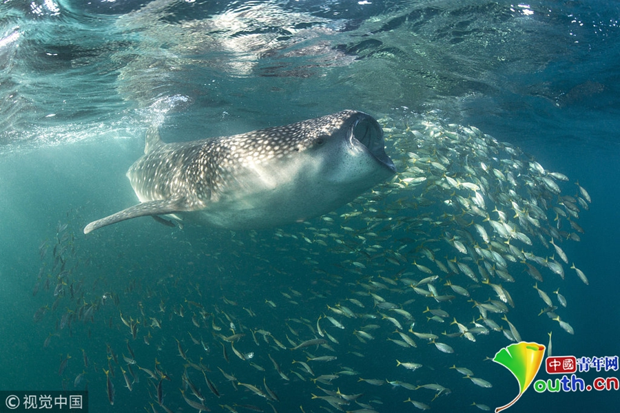 2018年3月30日訊(具體拍攝時(shí)間不詳),非洲,一只鯨鯊張開(kāi)大嘴試圖吞下似龍卷風(fēng)盤旋著的浮游生物群。