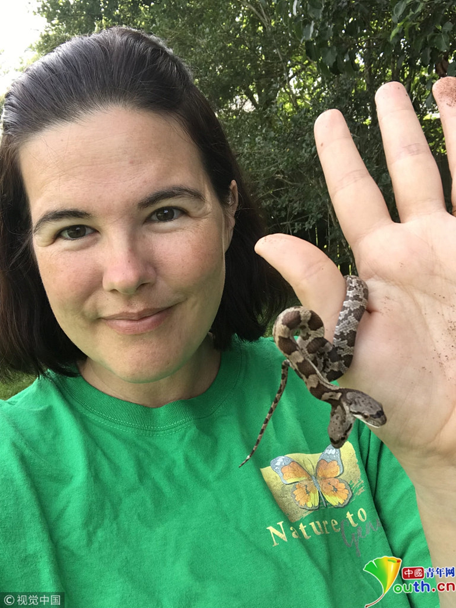 野生動物專家Tanee Janusz收養(yǎng)了同事在后院發(fā)現(xiàn)的一只雙頭錦蛇。圖片來源:視覺中國