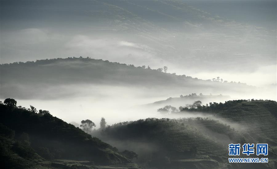 云霧繚繞的寧夏彭陽(yáng)縣金雞坪梯田公園(7月17日攝)。