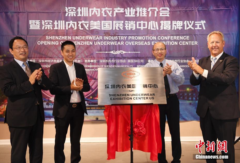 當(dāng)?shù)貢r間7月17日,深圳市內(nèi)衣行業(yè)協(xié)會在中美國際(美東)創(chuàng)業(yè)港——默特爾比奇市Waccoma Center舉行深圳內(nèi)衣產(chǎn)業(yè)推介會暨深圳內(nèi)衣美國展銷中心揭牌儀式。中美國際(美東)創(chuàng)業(yè)港聯(lián)合深圳市內(nèi)衣行業(yè)協(xié)會為深圳內(nèi)衣品牌進駐美東市場搭建綠色通道和產(chǎn)業(yè)孵化平臺,采用“時尚秀+靜態(tài)展”的形式,促進中美內(nèi)衣文化和時尚的交流。圖為霍里郡議會主席馬克先生Mark Lazrus(右一)、深圳市經(jīng)濟貿(mào)易和信息化委員會副主任高林(左一)、美國3W公司董事長王為工(右二)、深圳市內(nèi)衣行業(yè)協(xié)會常務(wù)副會長兼秘書長張峰偉(左二)出席揭牌儀式。中新社記者 陳文 攝