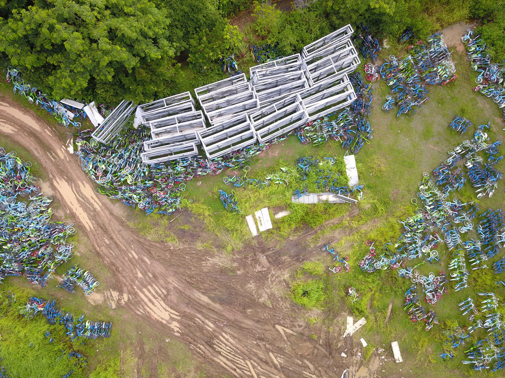 從高空中能夠看到,堆放的單車大多為目前無(wú)法正常運(yùn)營(yíng)的酷騎、小藍(lán)單車