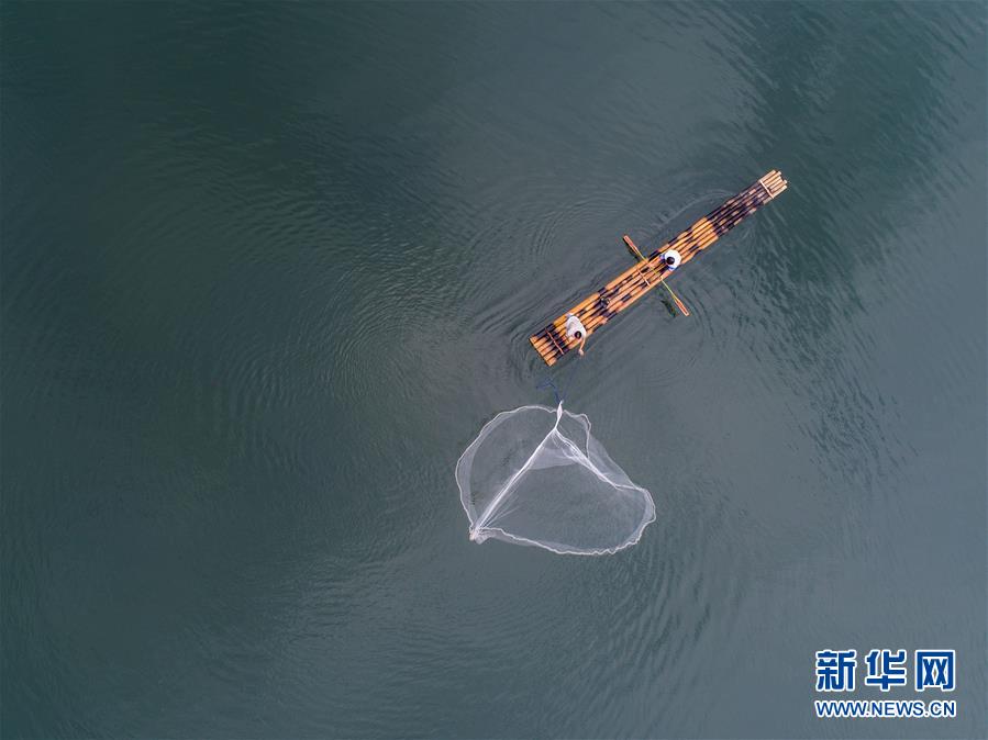8月1日,淳安縣汾口鎮(zhèn)紅星村的漁民乘著竹排,在千島湖的支流武強溪上進(jìn)行撒網(wǎng)捕撈作業(yè)(無人機拍攝)。 新華社記者 徐昱攝