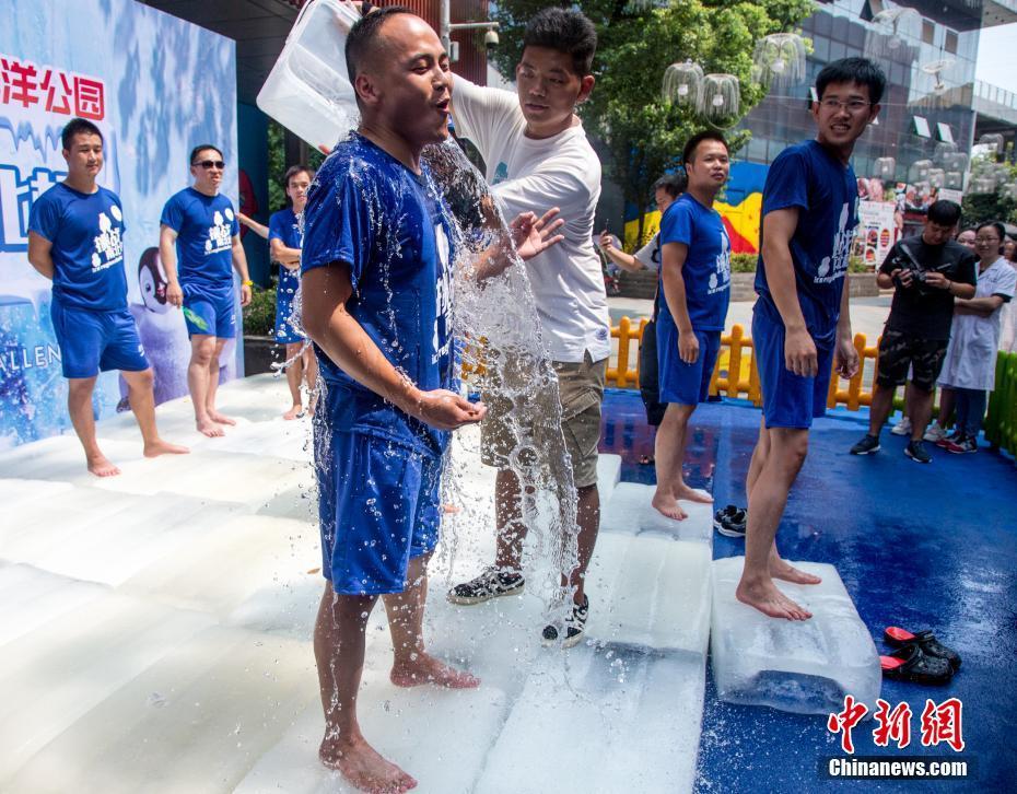 8月11日,在企鵝館舉行的決賽中,工作人員給參賽選手桶里加冰塊。當日,一場充滿趣味性的“冰極挑戰(zhàn)賽”在武漢海昌極地海洋世界上演,參賽者們經過“極地初體驗”和“極寒企鵝館耐寒挑戰(zhàn)”兩個環(huán)節(jié),堅持時間長者獲勝。中新社記者張暢 攝