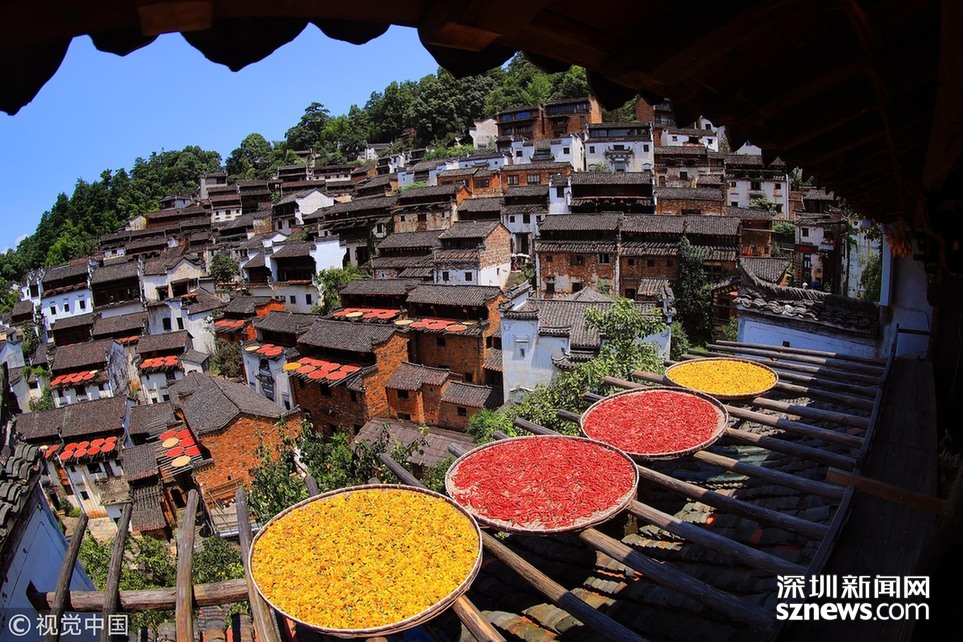 ??? 深圳新聞網(wǎng)訊 2018年8月7日,江西婺源縣篁嶺古村落,壯觀“曬秋”場(chǎng)景。當(dāng)日立秋節(jié)氣,江西婺源縣篁嶺古村的農(nóng)作物普遍豐收,村民們又迎來了一年一度的“曬秋”季。村民們將收獲來的紅辣椒、玉米、南瓜、稻谷和菊花等色彩斑斕的農(nóng)作物,晾曬在依山而建的徽派民居房前屋后的木制曬架上,在秋日陽光的照射下,色彩繽紛圓圓的曬扁,鋪就在錯(cuò)落有致的徽派民居之間,格外璀璨奪目,蔚為壯觀。目前,“篁嶺曬秋”已經(jīng)成為中國(guó)鄉(xiāng)村旅游的一張名片。