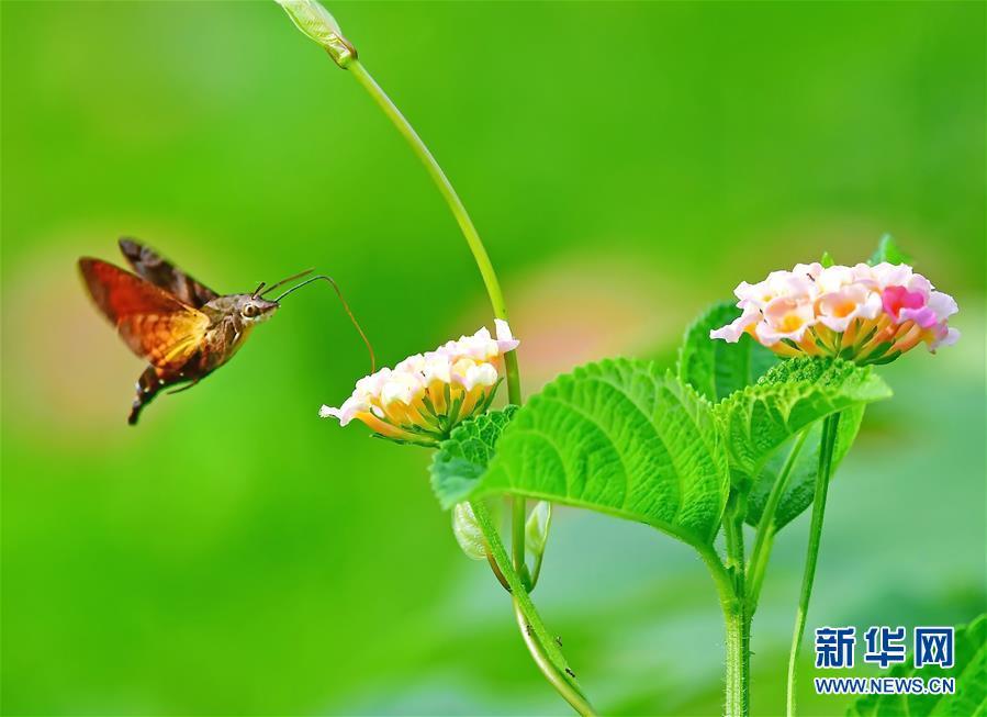 在福建省福州市溫泉公園,透翅天蛾在花間飛舞(8月18日攝)。近日,福建省福州市溫泉公園內(nèi)的馬纓丹大面積開放。花紅、草綠、蟲飛,構成了一幅和諧的閩都生態(tài)圖景。 新華社記者梅永存攝