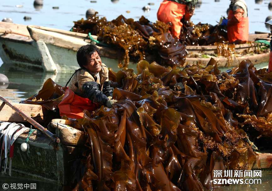 訊 2018年5月26日,在山東省榮成市一海上養(yǎng)殖區(qū),工人們正在收割海帶。
