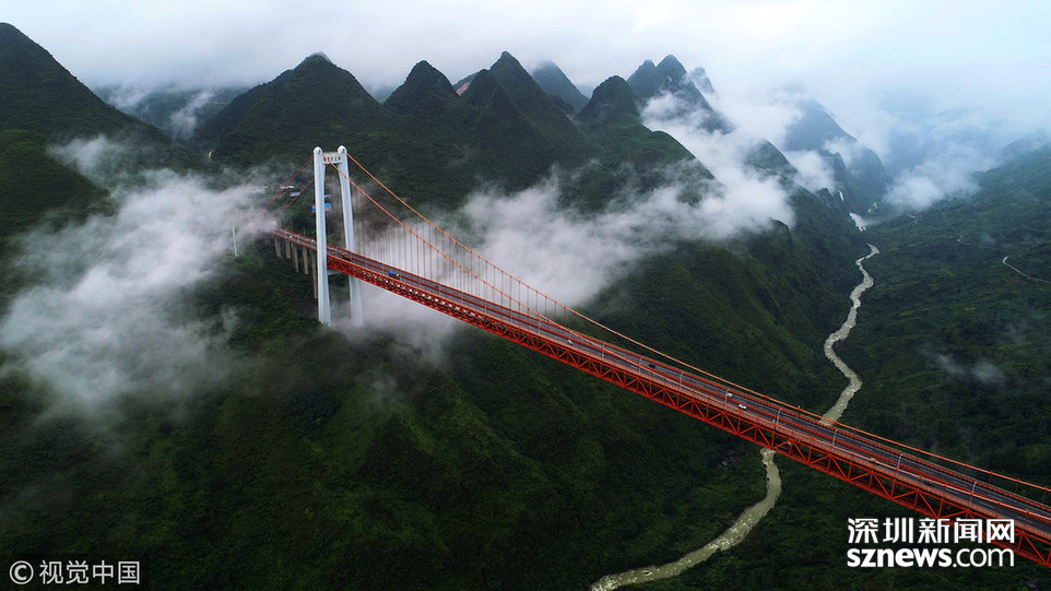 2018年6月26日,一場(chǎng)大雨后貴州省安順市關(guān)嶺縣壩陵河大峽谷云霧繚繞,橫跨兩岸的壩陵河大橋在云霧中時(shí)隱時(shí)現(xiàn),更顯雄偉壯觀。