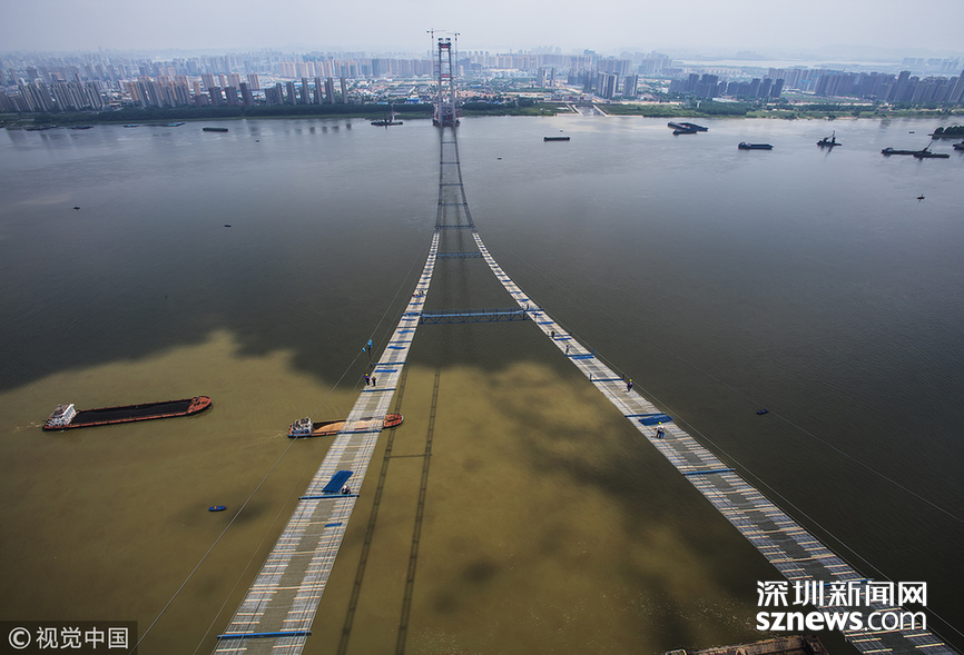 長江上空架“天梯” 武漢楊泗港長江大橋臨時(shí)“吊橋”形成