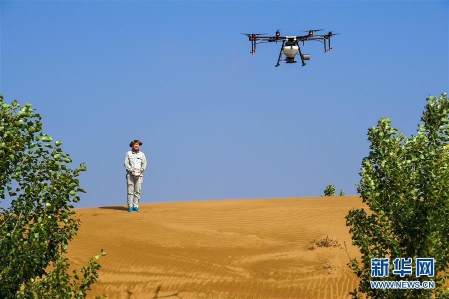 在內(nèi)蒙古鄂爾多斯市杭錦旗的庫(kù)布其沙漠中,技術(shù)人員操控?zé)o人機(jī)飛播造林(7月11日攝)。