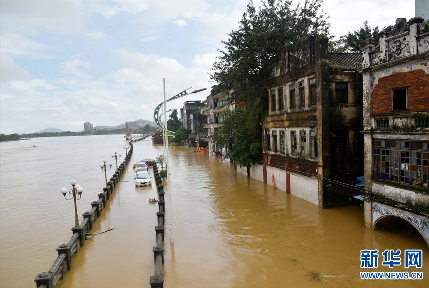 9月18日,陽(yáng)春市漠陽(yáng)江畔的街道被洪水淹沒(méi)。 新華社記者 周科 攝