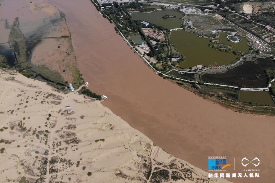 航拍黃河托克托段。黃河兩岸架起了跨黃河旅游觀光纜車。新華網(wǎng) 張偉 攝