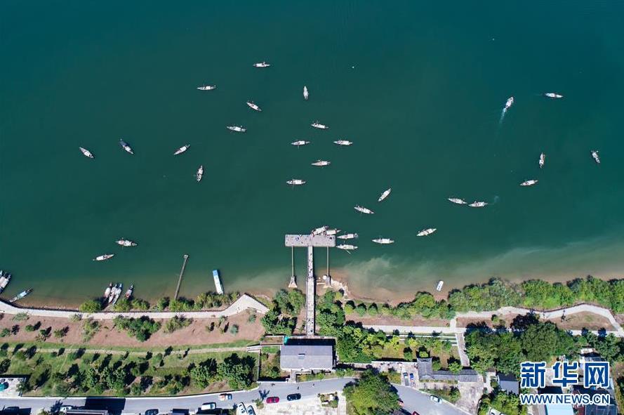9月18日,漁船陸續(xù)從碼頭出發(fā),行駛到富春江里捕撈江鮮(無人機(jī)拍攝)。