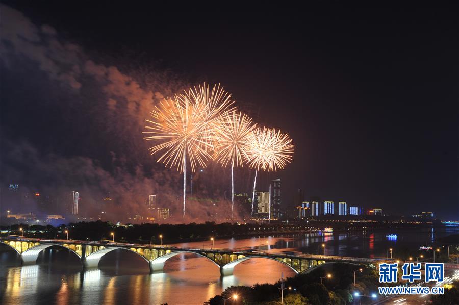 9月19日晚,湖南省長(zhǎng)沙市在湘江橘子洲舉辦焰火晚會(huì),絢麗的焰火與湘江兩岸的城市夜景交相輝映。