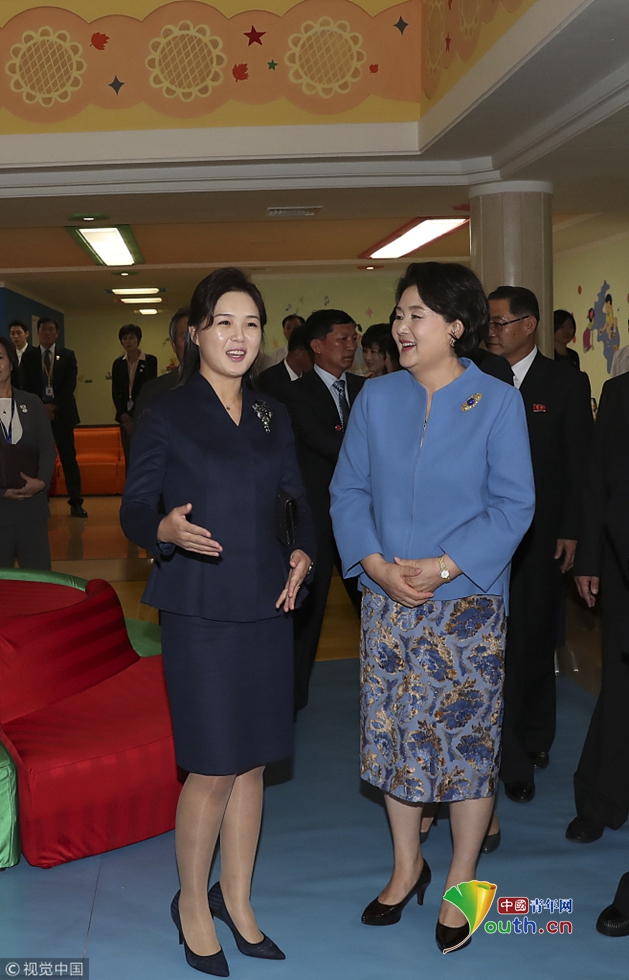 當(dāng)?shù)貢r(shí)間2018年9月18日,朝鮮平壤,韓國總統(tǒng)文在寅夫人金正淑在朝鮮國務(wù)委員會委員長金正恩夫人李雪主的陪同下參觀平壤金元均音樂大學(xué)。圖片作者:視覺中國