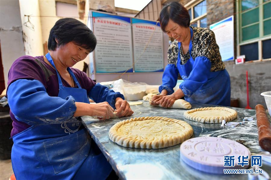 9月22日,段河村村民段粉拽(右前)在往月餅皮里放餡料。 中秋節(jié)來臨之際,山西省晉城市澤州縣南嶺鄉(xiāng)段河村的段富善一家人忙碌起來,他們家制作的“柴火月餅”遠近聞名。 “柴火月餅”起源于明清時期,餡料以糖搭配花生仁、芝麻、玫瑰等,有近10道制作工序,其中最有特色的是木柴烤制工藝,烘烤師傅必須掌握好火候,才能烤出外皮酥脆、餡料飄香的月餅。 新華社記者 曹陽 攝