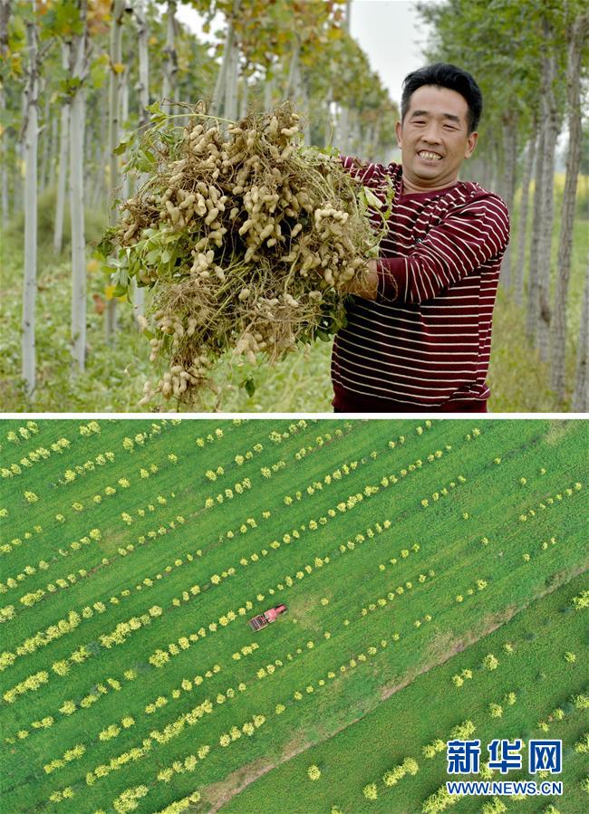 這張拼版照片顯示的是:上圖,9月18日,河北邢臺(tái)經(jīng)濟(jì)開發(fā)區(qū)郭龍莊村農(nóng)民王路坤展示收獲的花生;下圖,9月18日,王路坤駕駛農(nóng)機(jī)收獲花生(無人機(jī)拍攝)。 新華社記者牟宇攝