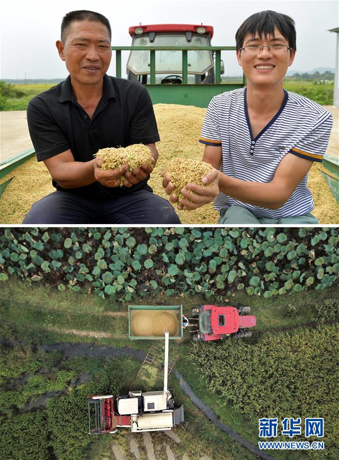 這張拼版照片顯示的是:上圖,9月21日,在江西省南昌市新建區(qū)留田村,種糧大戶周小林(左)、周標(biāo)父子展示收獲的稻谷;下圖,9月21日,周小林、周標(biāo)父子操作農(nóng)機(jī)收割中稻,同時(shí)將稻谷裝入拖拉機(jī)(無人機(jī)拍攝)。 新華社記者彭昭之?dāng)z