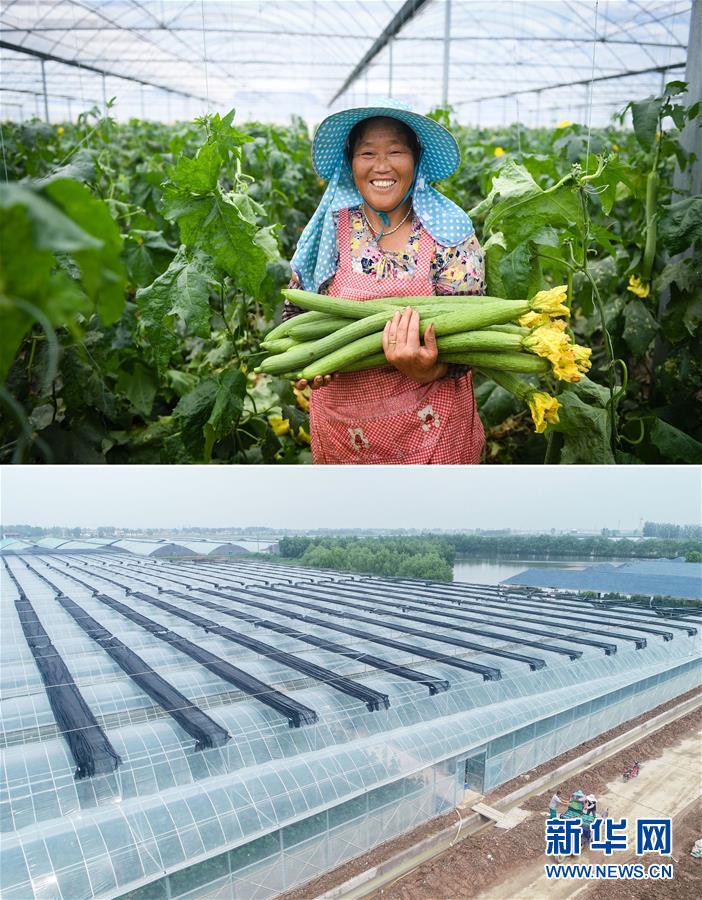 這張拼版照片顯示的是:上圖,9月21日,在江蘇省響水縣九豐現(xiàn)代高效農(nóng)業(yè)示范園的大棚內(nèi),56歲的農(nóng)民徐曉菊展示收獲的絲瓜;下圖,9月21日,徐曉菊(中)和村民一起搬運(yùn)收獲的絲瓜(無人機(jī)拍攝)。 新華社記者季春鵬攝