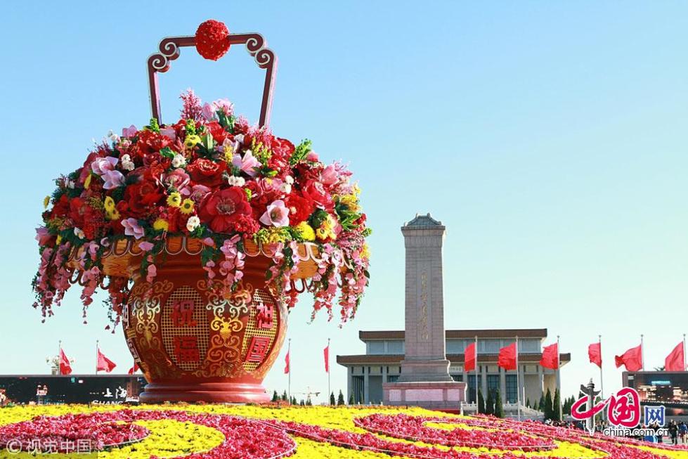 2012年天安門廣場中心花壇以“祝福祖國”為主題,以喜慶的花籃為主景?;▔睆?0米、頂高15米,以紅黃兩色為主打,花籃外圍,環(huán)繞著花草組成的祥云圖案。同時,主花壇設有燈光效果,即便是夜間游賞,也能清晰地看到“花容”。祝福祖國“花籃”凈高13米,籃盤直徑11米,真假花結(jié)合,選取牡丹、桃花、紫藤、百合等18個品種的花卉,最大花卉直徑2米?!盎ɑ@”通體中國紅,體現(xiàn)喜慶、祝福之意,配有金色紋絡,莊重、華貴?;@體鑲嵌三組“祝?!薄ⅰ白鎳弊謽拥臒粝??!盎ɑ@”底面是一品紅和小菊組成的如意圖案。