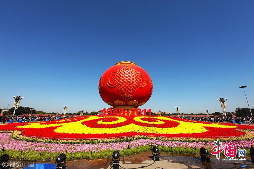 2011年10月04日,在北京蔚藍(lán)的天空下,“祝福祖國”的大型花壇屹立在天安門廣場(chǎng)中央。蘇陽攝影