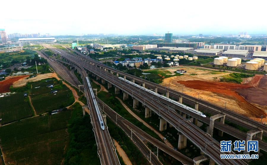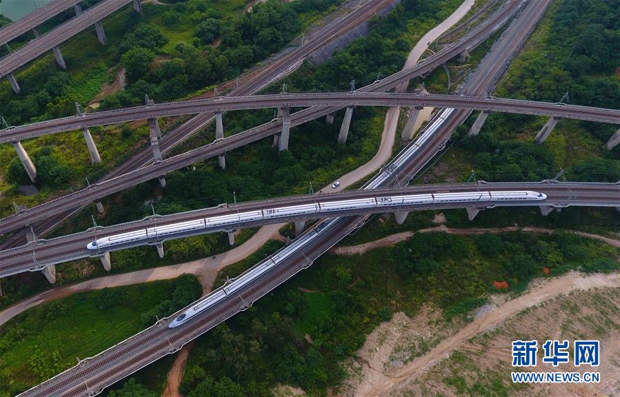 一列動車在南寧市區(qū)行駛(9月4日無人機(jī)拍攝)。 廣西壯族自治區(qū)成立60年來,鐵路建設(shè)發(fā)生翻天覆地的變化。來自中國鐵路南寧局集團(tuán)有限公司的數(shù)據(jù)顯示,1958年廣西鐵路總里程為1346.3公里,如今廣西鐵路總里程達(dá)5191公里。廣西與周邊相鄰省份間實(shí)現(xiàn)動車“公交化”開行。此外,北部灣港—重慶班列、東盟海產(chǎn)品冷鏈班列、“百色一號”果蔬專列等的開通和運(yùn)營,強(qiáng)化了鐵路供給的針對性和有效性。鐵路成為助推廣西經(jīng)濟(jì)社會快速發(fā)展的“大動脈”。 新華社記者陸波岸攝