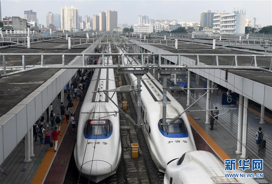 在廣西南寧站,旅客進(jìn)入站臺準(zhǔn)備乘坐動車出行(9月4日攝)。 廣西壯族自治區(qū)成立60年來,鐵路建設(shè)發(fā)生翻天覆地的變化。來自中國鐵路南寧局集團(tuán)有限公司的數(shù)據(jù)顯示,1958年廣西鐵路總里程為1346.3公里,如今廣西鐵路總里程達(dá)5191公里。廣西與周邊相鄰省份間實(shí)現(xiàn)動車“公交化”開行。此外,北部灣港—重慶班列、東盟海產(chǎn)品冷鏈班列、“百色一號”果蔬專列等的開通和運(yùn)營,強(qiáng)化了鐵路供給的針對性和有效性。鐵路成為助推廣西經(jīng)濟(jì)社會快速發(fā)展的“大動脈”。 新華社記者陸波岸攝