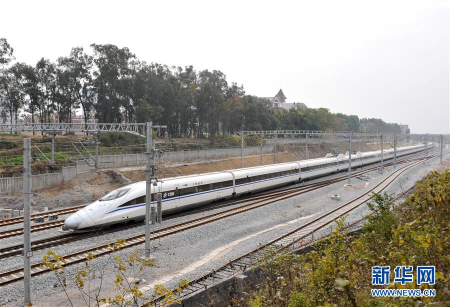廣西桂林至北京高鐵列車在桂林市靈川縣境內(nèi)行駛(2013年12月28日攝)。 廣西壯族自治區(qū)成立60年來,鐵路建設(shè)發(fā)生翻天覆地的變化。來自中國鐵路南寧局集團(tuán)有限公司的數(shù)據(jù)顯示,1958年廣西鐵路總里程為1346.3公里,如今廣西鐵路總里程達(dá)5191公里。廣西與周邊相鄰省份間實(shí)現(xiàn)動車“公交化”開行。此外,北部灣港—重慶班列、東盟海產(chǎn)品冷鏈班列、“百色一號”果蔬專列等的開通和運(yùn)營,強(qiáng)化了鐵路供給的針對性和有效性。鐵路成為助推廣西經(jīng)濟(jì)社會快速發(fā)展的“大動脈”。 新華社記者陸波岸攝