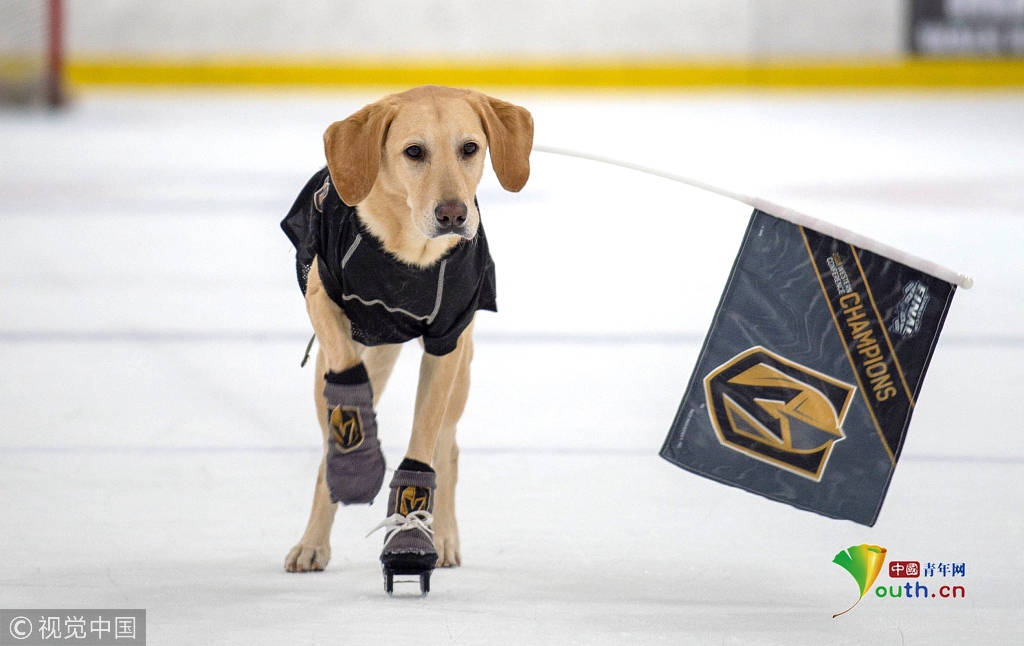 2018年9月26日訊。(具體拍攝時間不詳)這只可愛的拉布拉多犬本尼是世界上第一只會滑冰的狗。