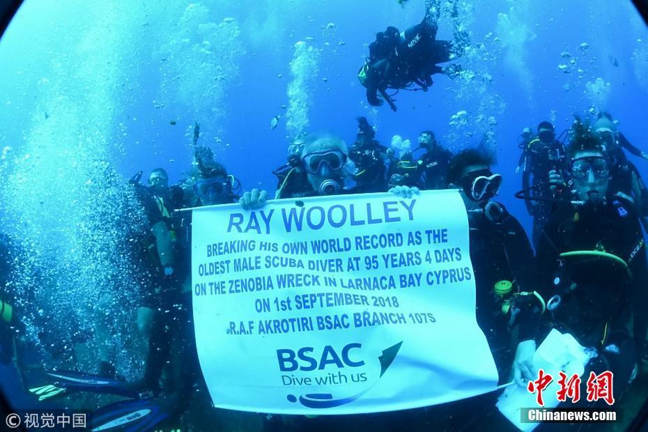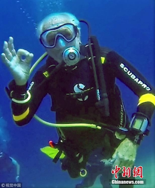 當(dāng)?shù)貢r(shí)間2018年9月1日,塞浦路斯,95歲的英國(guó)潛水員雷·伍利(Ray Woolley)以44分鐘下潛40.5米的成績(jī)打破了自己94歲達(dá)成的記錄(41分鐘下潛38.1米),二度刷新了世界上年齡最大的男性潛水員最好成績(jī)。在此次下潛中,這位二戰(zhàn)退伍老兵對(duì)距塞浦路斯南部城鎮(zhèn)拉納卡約2公里處的海域進(jìn)行了探索,1980年一艘名為“芝諾比亞號(hào)”(Zenobia)的貨船在這里進(jìn)行首次航行時(shí)沉沒。圖片來源:視覺中國(guó)