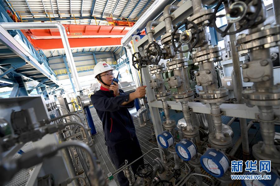 延安煤油氣資源綜合利用項(xiàng)目甲醇制烯烴中心的工作人員在進(jìn)行設(shè)備巡檢(9月28日攝)。新華社記者劉瀟攝