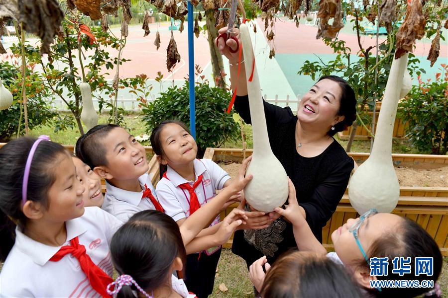 9月29日,在威海市經(jīng)濟(jì)技術(shù)開(kāi)發(fā)區(qū)新都小學(xué),老師帶著學(xué)生采摘葫蘆。