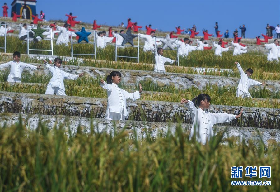 9月29日,太極拳愛好者在建德市大洋鎮(zhèn)高垣村的千畝梯田上進(jìn)行表演。當(dāng)日,2000多名太極拳愛好者在浙江省建德市大洋鎮(zhèn)高垣村的千畝梯田上參加太極拳表演,吸引很多當(dāng)?shù)厝撕陀慰颓皝碛^賞,助力當(dāng)?shù)亟鹎飼r節(jié)鄉(xiāng)村旅游。近兩年來,大洋鎮(zhèn)充分利用土地整治后形成的千畝梯田打造農(nóng)業(yè)觀光綜合體,發(fā)展綜合型農(nóng)業(yè)觀光旅游,為鄉(xiāng)村振興注入新活力。新華社記者徐昱攝