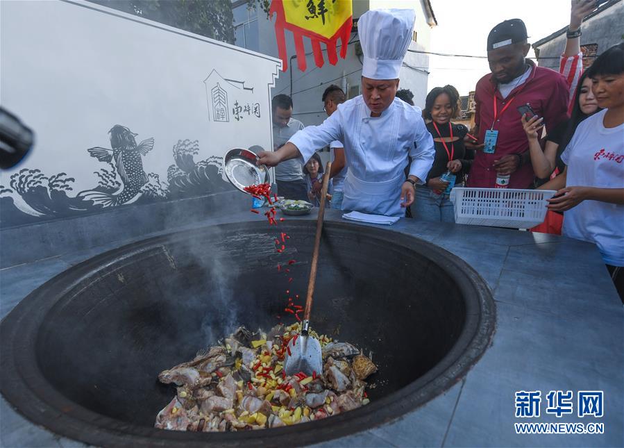 9月30日,廚師在中外游客的圍觀下烹飪“江鮮第一鍋”。當(dāng)日,浙江省杭州市富陽(yáng)區(qū)場(chǎng)口鎮(zhèn)東梓關(guān)村開(kāi)啟“江鮮第一鍋”,幾位大廚聯(lián)手在直徑1.5米的大鍋內(nèi)烹制美味江鮮,這也是當(dāng)?shù)亍敖r大會(huì)”的重頭戲。東梓關(guān)村有著1000多年歷史,古就是富春江南岸重要的商貿(mào)集散地,素有富春江“東流第一關(guān)”之稱。隨著近年來(lái)美麗鄉(xiāng)村建設(shè)的推進(jìn),東梓關(guān)村著力打造粉墻黛瓦的江南民居,同時(shí)依托富春江豐富的江鮮魚類資源,在秋季舉辦特色“江鮮大會(huì)”,通過(guò)江鮮捕撈體驗(yàn)、江鮮第一鍋、百鮮宴、農(nóng)家菜大賽等活動(dòng),吸引各地游客前來(lái)感受富春江漁民豐收的喜悅和千年古村的獨(dú)特魅力,推動(dòng)鄉(xiāng)村特色旅游發(fā)展。新華社記者徐昱攝