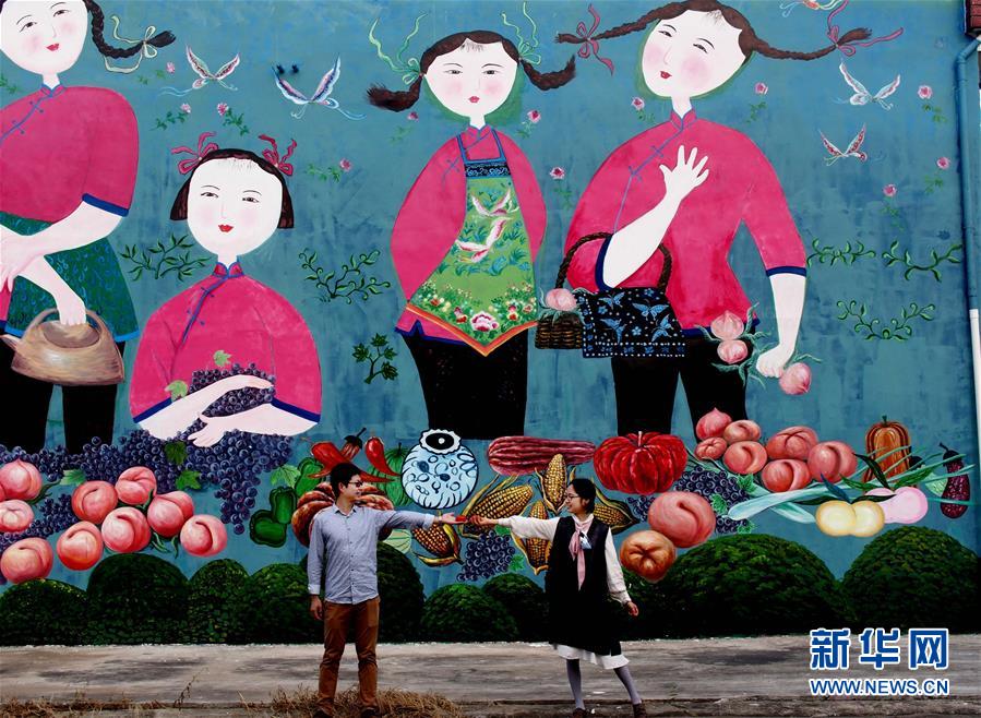 10月1日,游人在和平村的民居壁畫前留影。新華社記者任瓏攝