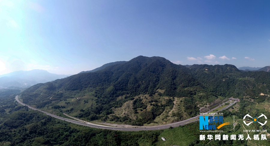 這是改擴(kuò)建工程施工之后的風(fēng)霜嶺隧道外景觀。道路拓寬,坡度平緩(無人機(jī)拍攝)。新華網(wǎng) 肖和勇 攝