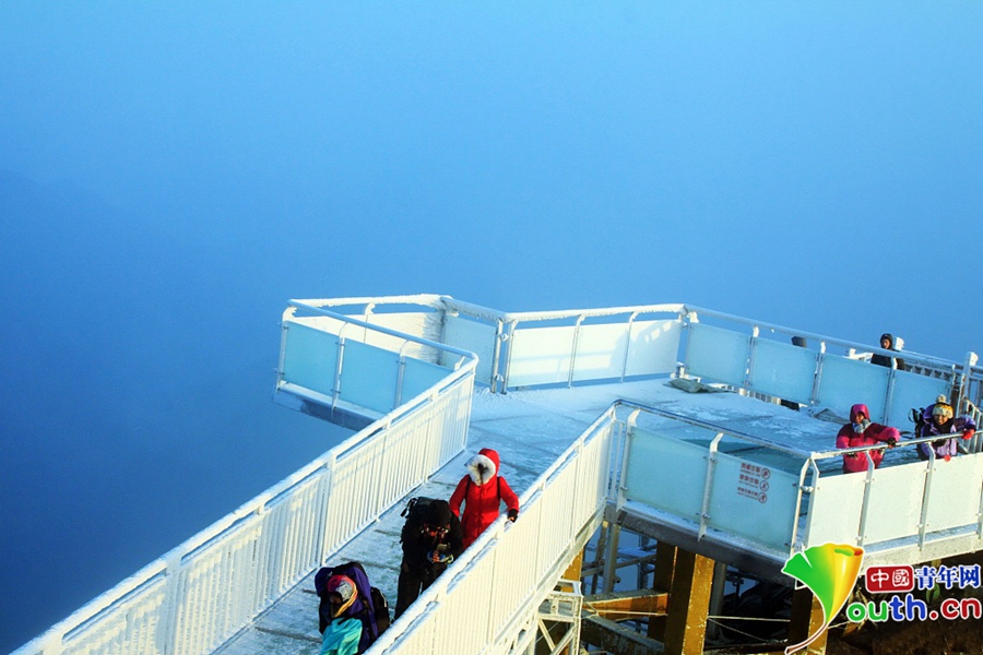 上到金子山最高峰可以看到,玻璃天梯像一條巨龍,沿著金子山最高峰山腰蜿蜒而上,每一個(gè)階梯都是玻璃做的,頂上是藍(lán)天白云,四周是莽莽群山,天梯下面是深不可測的懸崖絕壁?!?/p>