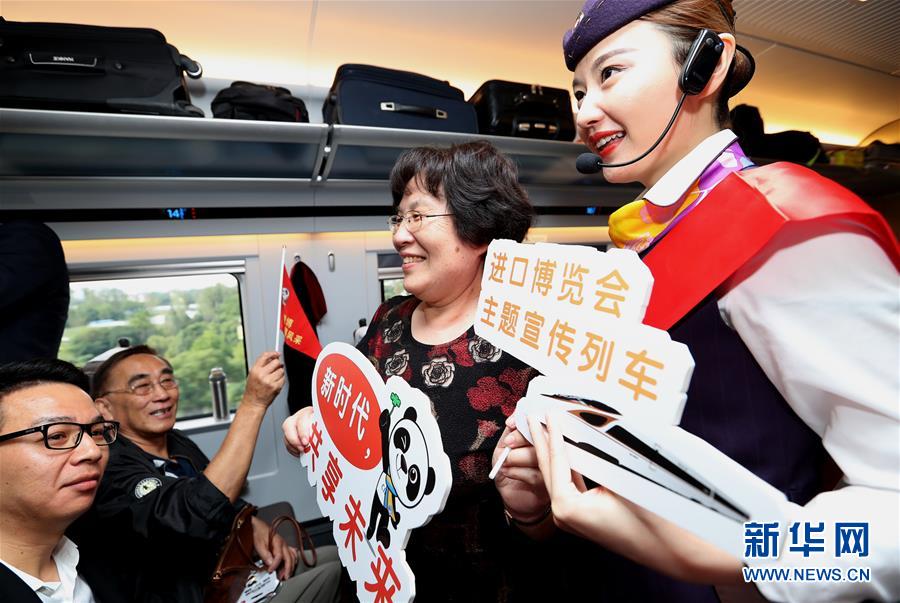10月10日,G2次列車乘務(wù)員向旅客講解首屆中國國際進(jìn)口博覽會相關(guān)信息。 新華社記者陳飛攝