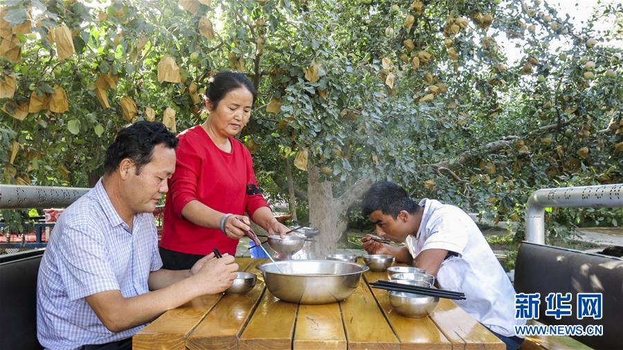 甘永軍(左一)在地處新疆阿克蘇地區(qū)柯柯牙綠化工程內(nèi)的果園吃飯(2017年9月22日攝)。10年前,甘永軍還在果園開起了第一個(gè)農(nóng)家樂,帶動周邊100多戶果農(nóng)經(jīng)營起了自家庭院。 在世界第二大流動性沙漠——塔克拉瑪干沙漠西北邊,一條逾百萬畝的人工林帶傲然挺立。 這條林帶就是柯柯牙荒漠綠化工程。它是新疆阿克蘇黃沙漫漫和碧波萬頃的分界嶺。 1986年,為改變惡劣的自然條件,阿克蘇啟動柯柯牙綠化工程。30年間,各族干部群眾攜手奮斗,曾是沙塵暴策源地的柯柯牙綠樹成蔭;并以此為原點(diǎn),在南疆戈壁荒灘上孕育出百萬畝的“綠?!?。 30多年來,阿克蘇打造出“人走政不息”的樣本,使綠色發(fā)展理念成為幾代人的廣泛共識;“自力更生、艱苦奮斗、無私奉獻(xiàn)”的柯柯牙精神,已融入各族兒女血液中;“以林養(yǎng)林”“邊綠化邊脫貧”的綠化、脫貧方式,給其他荒漠地區(qū)貢獻(xiàn)了“柯柯牙智慧”。 新華社記者 杜剛 攝