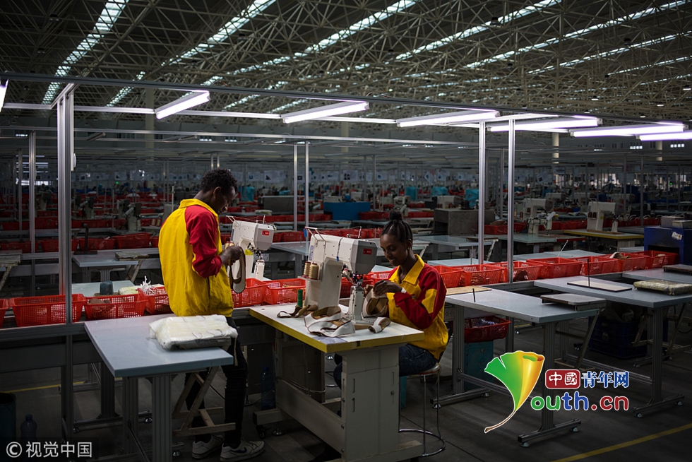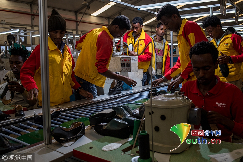 當(dāng)?shù)貢r(shí)間2018年8月1日,埃塞俄比亞。埃塞俄比亞首都亞的斯亞貝巴南部郊外,有一座東方工業(yè)園,這是中國在埃塞俄比亞的首個(gè)國家級(jí)境外經(jīng)貿(mào)合作區(qū)。園區(qū)占地5平方公里,連接著兩個(gè)60萬人口的城鎮(zhèn),目前已經(jīng)有85家企業(yè)入駐,行業(yè)涉及紡織、服裝、制鞋、鋼筋、水泥、制藥、汽車組裝等,這些企業(yè)絕大部分來自中國。圖為鞋廠工人在2015年啟用的新廠區(qū)內(nèi)工作。